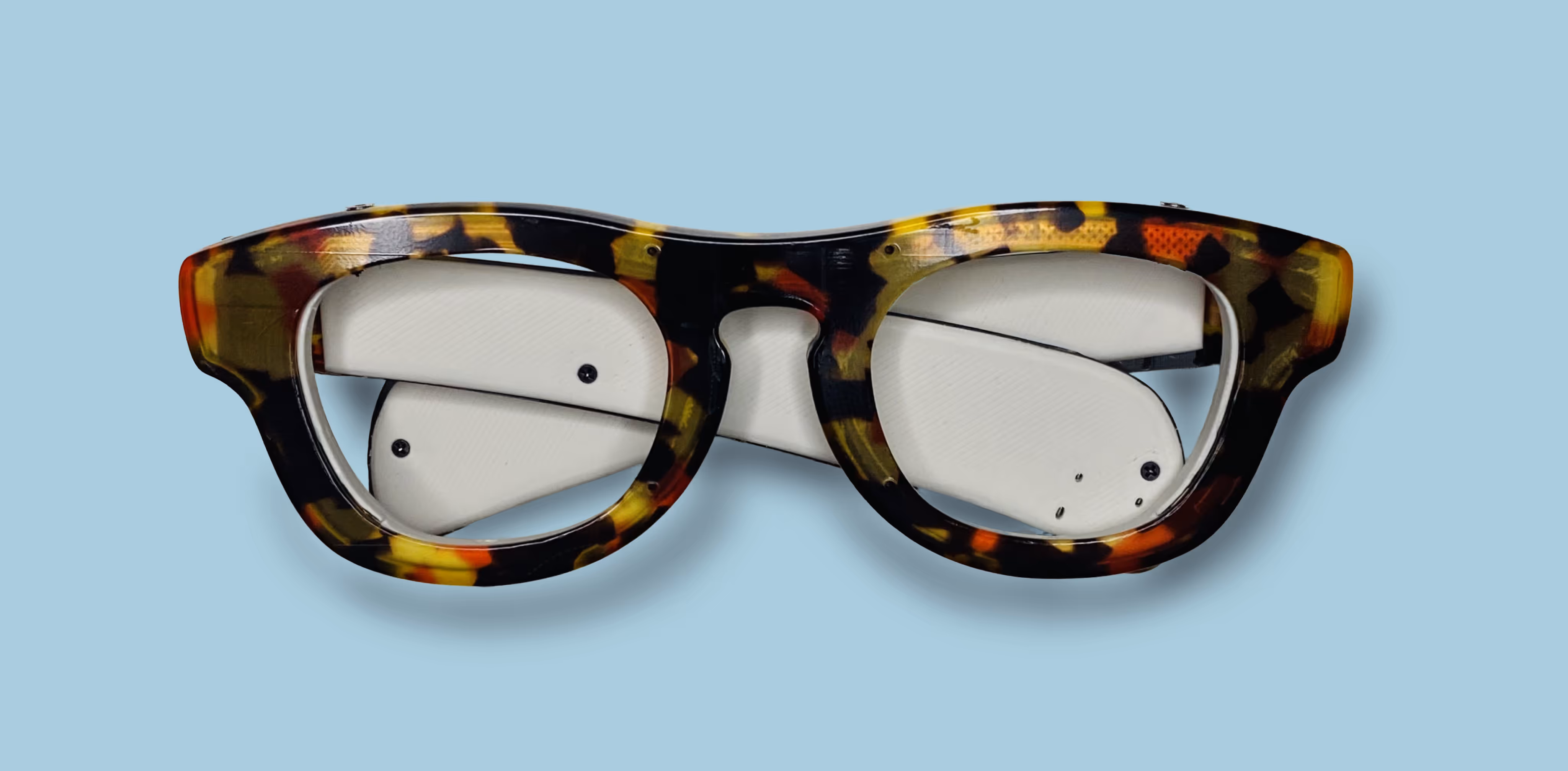 My biggest concern was the weight and width of the PCBs making the glasses not fit over the ears or press too hard on nose bridge. I eventually found a temple shape which sits the heavier components above and behind the ear- counterbalancing the front and making them feel weightless on the nose. I printed the final internal parts in a matte white PLA (for LED diffusion) and machined the outer parts in a tortoise cellulose acetate.