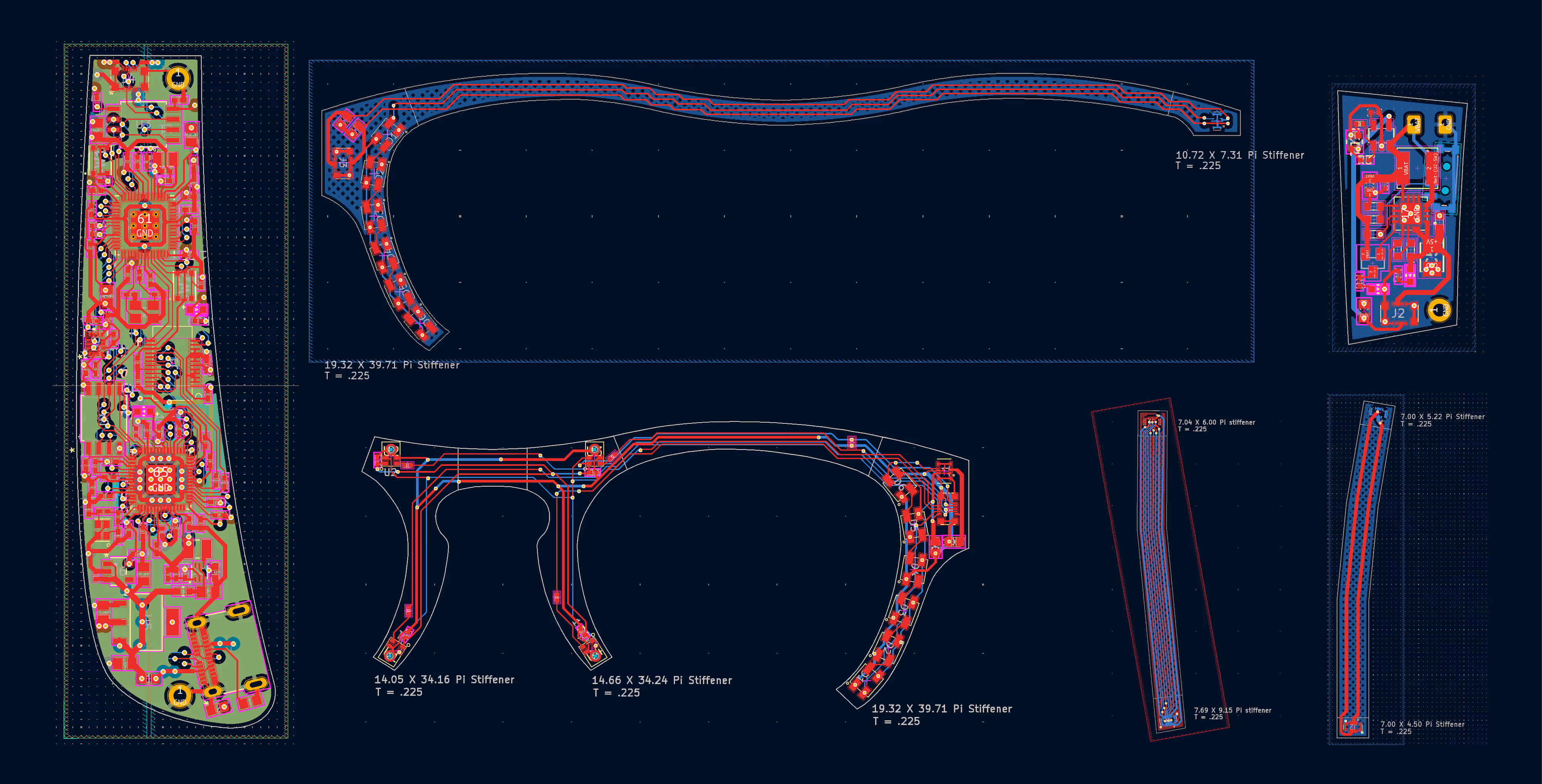 As I was designing the PCBs, I iterated the design of the frame housing to understand how the components would fit and be integrated comfortably. I imagined a 2 part assembly sandwiching the components in place. An important detail I had to navigate were the hinges; they had to allow the FPCs to pass through while keeping them secure and supporting the full range of motion for the temple.
